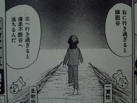 右端を「一貫性」、左端を「柔軟性」という道に例えなおすと、 右(一貫性)に行き過ぎれば「頑固谷」、左(柔軟性)に行き過ぎれば「優柔不断谷」に落ちてしまう。