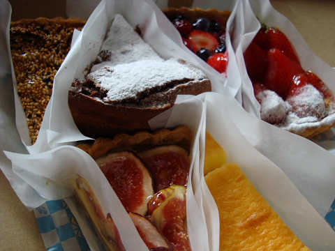 家に帰り包みを開いてみると、まぁおいしそうなタルト&タルト。 いちじくだのイチゴだの大ぶりで見事なタルトが7切れ。